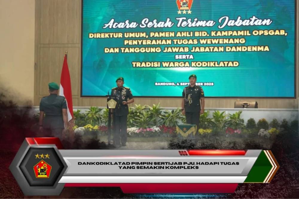 Bandung, Suasana khidmat dan penuh kebersamaan mewarnai acara serah terima jabatan Dirum, Pamen Ahli Bidang Kampamil Opsgab Kodiklatad, penyerahan tugas, wewenang dan tanggung jawab jabatan Dandenma Kodiklatad serta tradisi warga Kodiklatad. Kegiatan tersebut dipimpin langsung oleh Komandan Kodiklatad Letjen TNI Mohamad Hasan di Aula Mohamad Toha Kodiklatad, Kamis (4/9/2025).