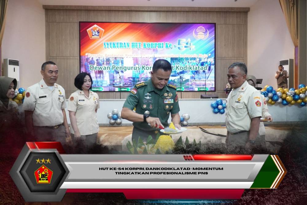 Bandung. Komandan Kodiklatad Letjen TNI Mohamad Hasan yang diwakili Pabanpers Sdirum Kodiklatad Kolonel Inf Hendi Ahmad Pribadi, S.I.P., M.I.P., M.Han., menghadiri acara syukuran HUT ke-54 Korpri Tahun 2025 yang berlangsung di Aula M. Toha Kodiklatad, Selasa (2/12/2025).