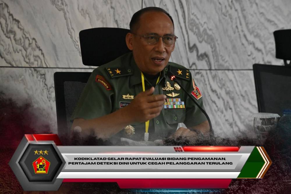 Bandung. Kodiklatad menggelar rapat evaluasi bidang pengamanan satuan jajaran Kodiklatad yang dipimpin oleh Direktur Umum Kodiklatad Brigjen TNI Saiful Rizal, S.Sos., bertempat di Ruang Rapat Ganesha 3 Kodiklatad, Kamis (18/12/2025).