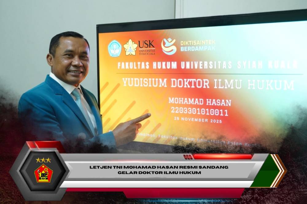 Banda Aceh. Komandan Kodiklatad Letjen TNI Mohamad Hasan secara resmi mengikuti prosesi yudisium Program Doktor Ilmu Hukum bertempat di Ruang Rapat Pimpinan Fakultas Hukum Universitas Syiah Kuala (USK), Selasa (25/11/25).