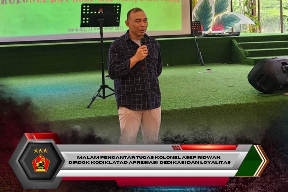 Subang. Direktur Doktrin (Dirdok) Kodiklatad Brigjen TNI Teguh Pudji Rahardjo memimpin acara malam pengantar tugas Pabanorg Sdirdok Kodiklatad Kolonel Kav Asep Ridwan, S.E., M.Si., yang berlangsung di Asstro Highland, Ciater, Kabupaten Subang, Jumat (21/11/2025).