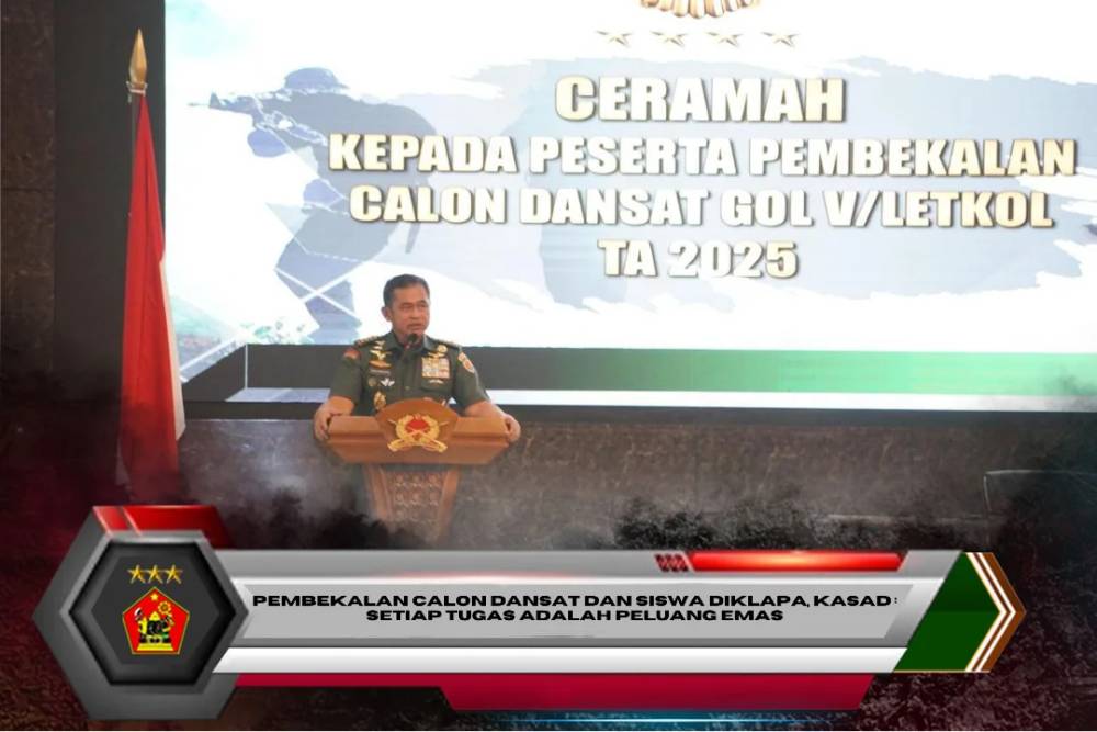 Bandung, Komandan Kodiklatad Letjen TNI Mohamad Hasan diwakili Wadan Kodiklatad Mayjen TNI Izak Pangemanan, M.Tr.(Han) mendampingi Kepala Staf Angkatan Darat (Kasad) Jenderal TNI Maruli Simanjuntak, M.Sc., memberikan pembekalan kepada 176 calon Komandan Satuan (Dansat) Golongan V berpangkat Letnan Kolonel (Letkol) dan 133 siswa Pendidikan Lanjutan Perwira (Diklapa) Gelombang II yang bertempat di Graha Yudha Wastu Pramukha Pussenif. Kamis (14/8/2025).