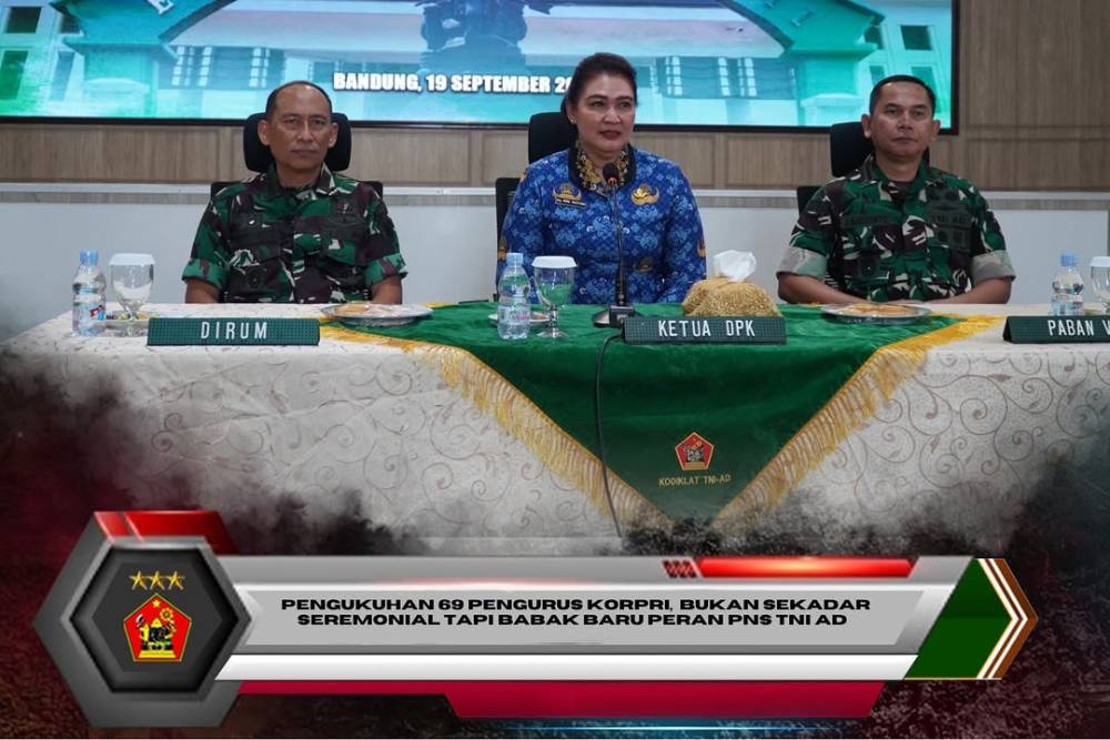 Bandung. Komandan Kodiklatad Letjen TNI Mohamad Hasan yang diwakili Direktur Umum Kodiklatad Kolonel Arm Saiful Rizal, S.Sos., menghadiri acara pengukuhan Dewan Pengurus Korpri Sub Unit Kodiklatad, Secapaad, Pussenkav dan Disjarahad. Kegiatan dipimpin oleh Ketua Dewan Pengurus Korpri Unit TNI AD, Ibu drg. Nora Tristyana, M.A.R.S., bertempat di Aula Moh Toha Kodiklatad, Jumat (19/9/2025).