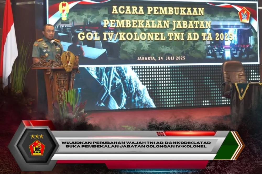 Jakarta, Komandan Kodiklatad Letjen TNI Mohamad Hasan secara resmi membuka kegiatan pembekalan Jabatan golongan IV/Kolonel TA 2025 yang digelar di Aula Mapusziad. Senin (14/7/2025).