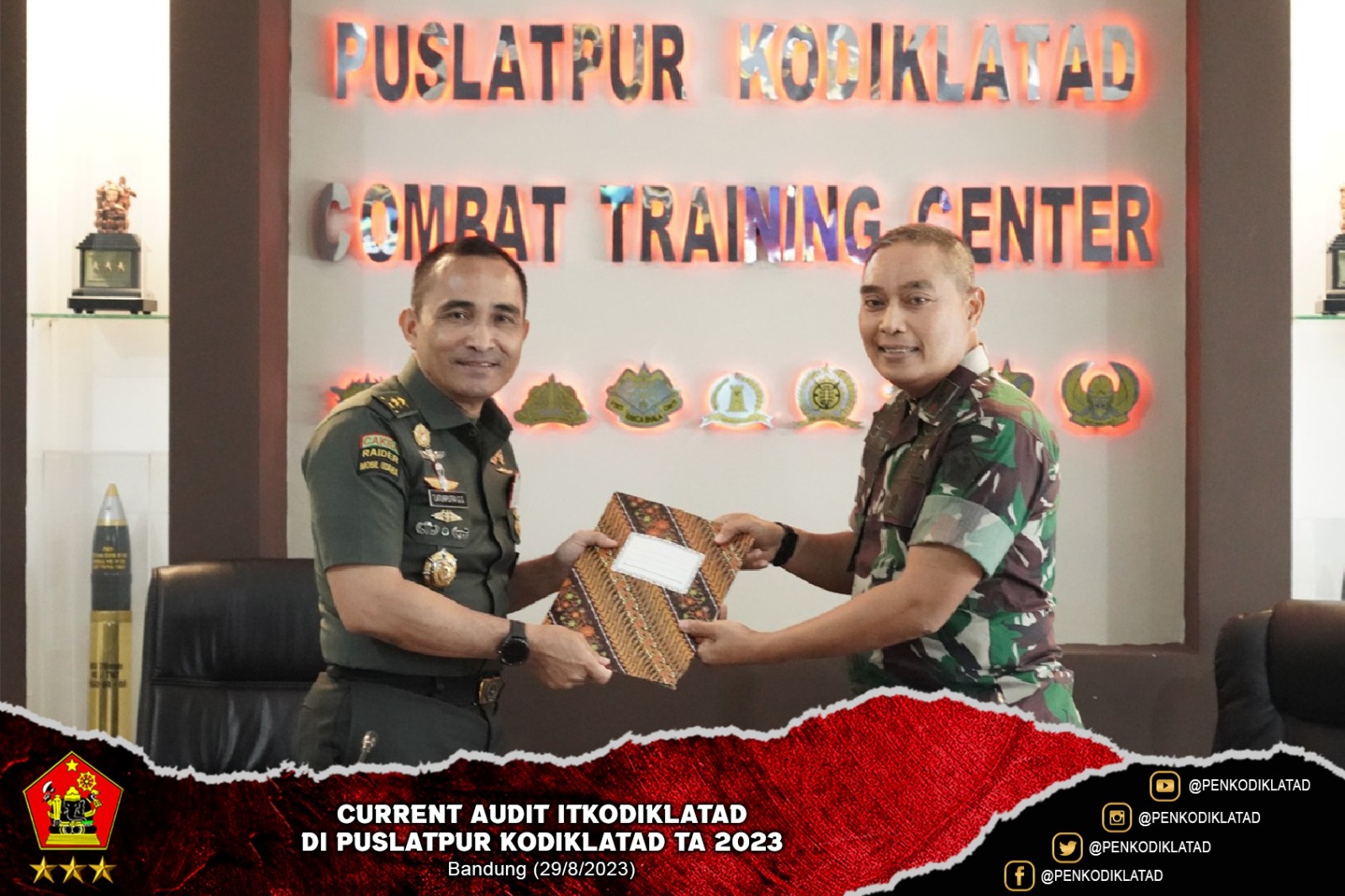 Kedatangan Tim Current Audit Itkodiklatad di sambut hangat oleh Danpuslatpur Brigjen TNI Suparlan Purwo Utomo, S.I.P., M.Si. yang di dampingi oleh para Danden dan Pa Staf Puslatpur. Kegiatan Current Audit Itkodiklatad TA. 2023 berlangsung selama dua hari dari tanggal 29 s.d. 30 Agustus 2023.