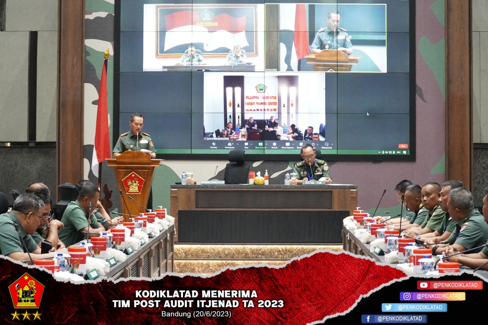Bandung. Wakil Komandan Kodiklatad, Mayjen TNI Candra Wijaya M.A. mewakili Komandan Kodiklatad Letjen TNI Arif Rahman M.A. menerima Ketua Tim Post Audit Itjenad, Brigjen TNI Joko Priyanto, S.Sos., M.M. dalam kegiatan Taklimat Awal Pengawasan Post Audit Itjenad TA 2023 di bertempat di Ruang Rapat Ganesha Kodiklatad. Selasa (20/6/2023)