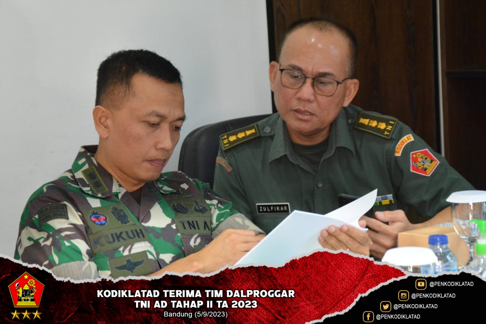 Bandung. Dalam rangka pengendalian program dan kegiatan Satker Kodiklatad serta jajarannya agar sesuai dengan regulasi yang berlaku, tepat sasaran, berdaya guna dan bermanfaat, maka perlu dilaksanakan Pengendalian Program dan Anggaran. Staf Direktur Perencanaan Kodiklatad menerima Tim Dalproggar TNI AD Tahap II TA 2023 di ruang Rapat Sdirren Kodiklatad. Selasa (5/9/2023)