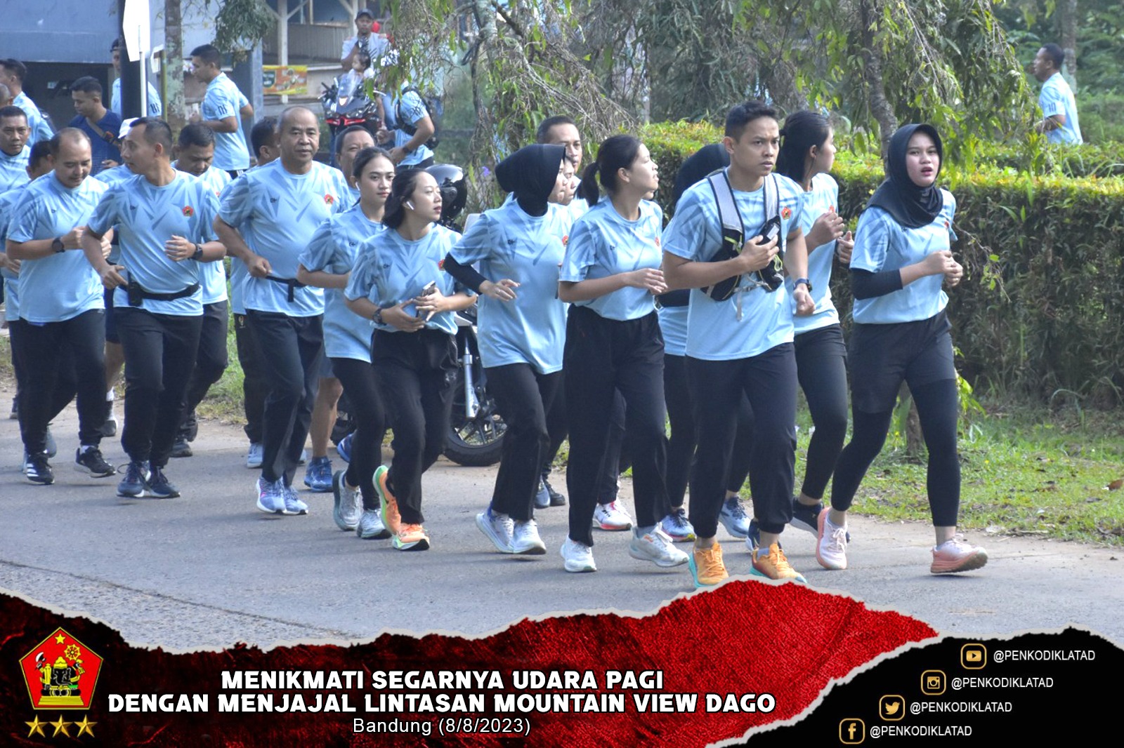 Bandung. Dalam membudayakan hidup sehat, Dankodiklatad Letjen TNI Arif Rahman, M.A. bersama para PJU, para Pamen serta Team Tradoc Runners Kodiklatad melaksanakan Olahraga lari dan jalan pagi bersama dengan rute Mountain View Complex, Dago Pakar. Selasa (8/8/2023)