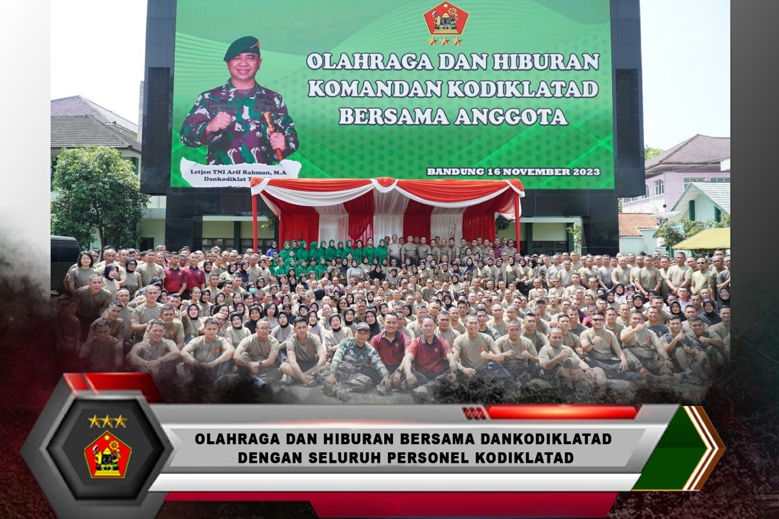 Bandung. Komandan Kodiklatad, Letjen TNI Arif Rahman, M.A. didampingi Ketua Persit KCK PG Kodiklatad melaksanakan kegiatan Olahraga bersama dan hiburan dengan seluruh personel Makodiklatad dan Pengurus Persit KCK PG Kodiklatad bertempat di Lapangan Apel. Kamis (16/11/2023)