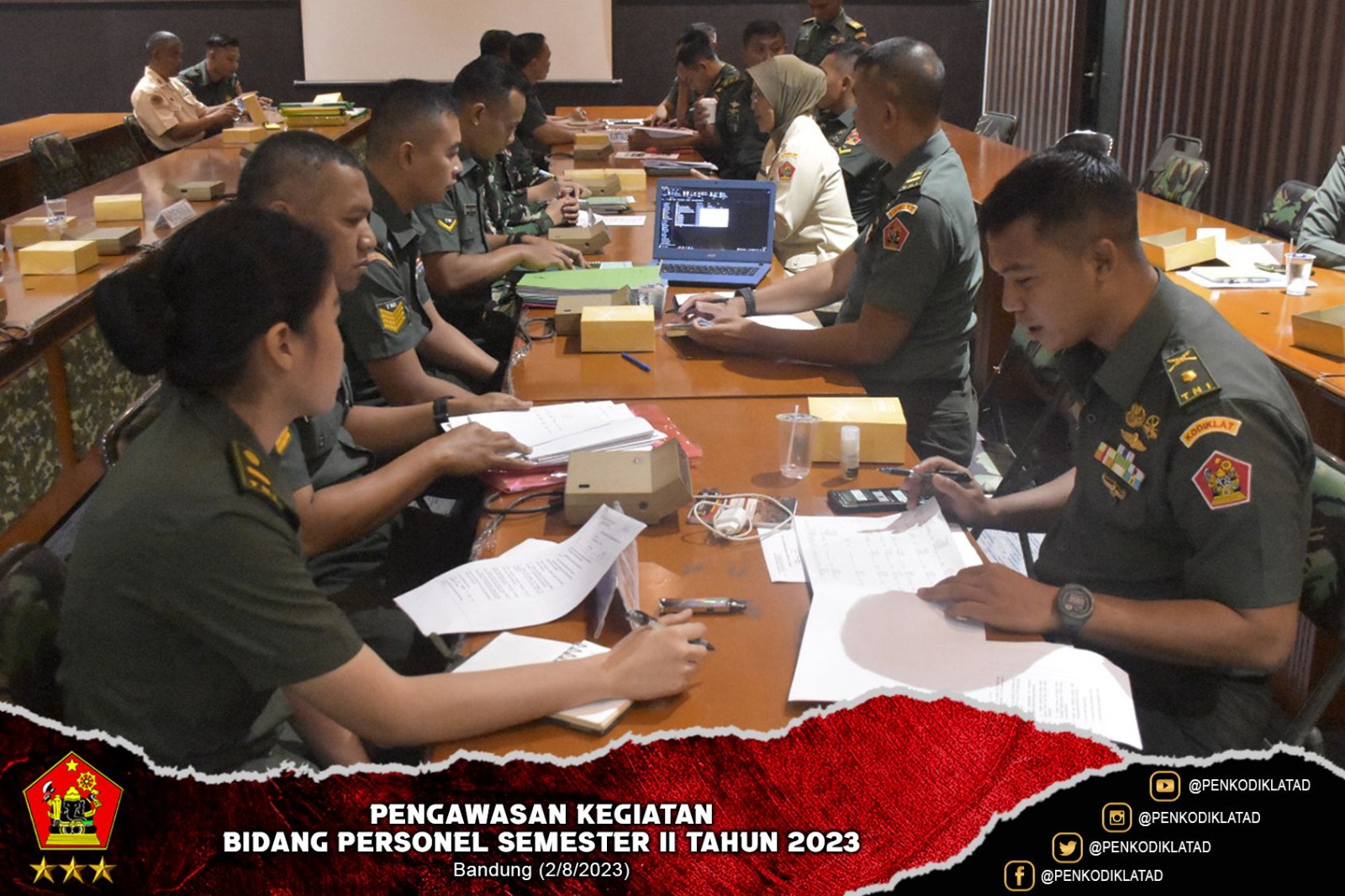 Bandung. Guna menghasilkan SDM terbaik dan unggul sebagai aset kekuatan pertahanan di lingkungan Angkatan Darat, pimpinan satuan melakukan pembinaan secara sistematis dan berkelanjutan diantaranya dengan Pembinaan Personel. Pabanpers Sdirum Kodiklatad, Kolonel Inf Ardianto, S.I.P. memimpin kegiatan Pengawasan Bidang Personel Semester II Tahun 2023 bertempat di Gedung Sudirman Kodiklatad. Rabu (2/8/2023)