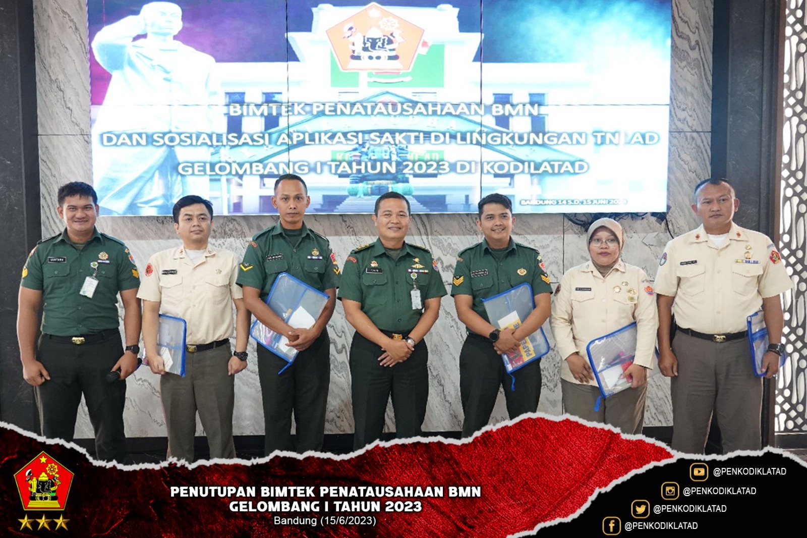 Bandung. Bimtek Penatausahaan BMN dan Sosialisasi Aplikasi Sakti Gelombang I Tahun 2023 di Makodiklatad yang telah berlangsung selama 2 hari sejak tanggal 14 Juni 2023 telah berakhir. Bimtek ini ditutup secara resmi oleh Pabandya-2/Matfasjasa/BMN Spabanlog Sdirum Kodiklatad, Letkol Czi Ir. Zulfikar, M.M bertempat di ruang Ganesha 3 Makodiklatad. Kamis (15/6/2023)