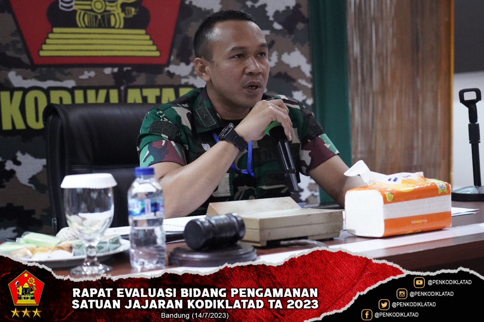 Dirum Kodiklatad saat membuka rapat menyampaikan bahwa rapat evaluasi bidang pengamanan yang dilaksanakan ini bertujuan untuk menyampaikan evaluasi program dan anggaran semester I TA 2023 dan sebagai wahana untuk mempererat hubungan kerja sama yang harmonis diantara sesama komuniti pengamanan Kodiklatad.