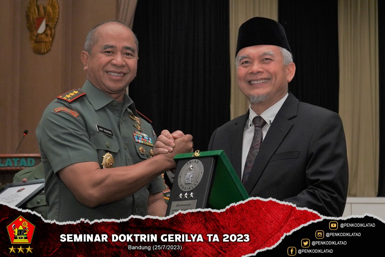 Bandung. Menindaklanjuti terbitnya Doktrin Operasi Militer Darat yang merupakan inisiasi Kepala Staf Angkatan Darat yang berisikan perubahan terkait pelibatan dan pembabakan dalam penggunaan satuan matra, Dankodiklatad Letjen TNI Arif Rahman, M.A. membuka Seminar Doktrin Gerilya TA 2023 di Gedung M. Toha Kodiklatad. Selasa (25/7/2023)