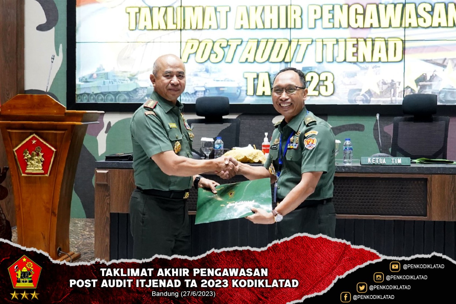 Bandung. Komandan Kodiklatad, Letjen TNI Arif Rahman, M.A. bersama Ketua Tim Post Audit Itjenad, Brigjen TNI Joko Priyanto, S.Sos., M.M. menutup kegiatan Taklimat Akhir Pengawasan Post Audit Itjenad TA 2023 di Ruang Rapat Ganesha Kodiklatad. Selasa (27/6/2023)