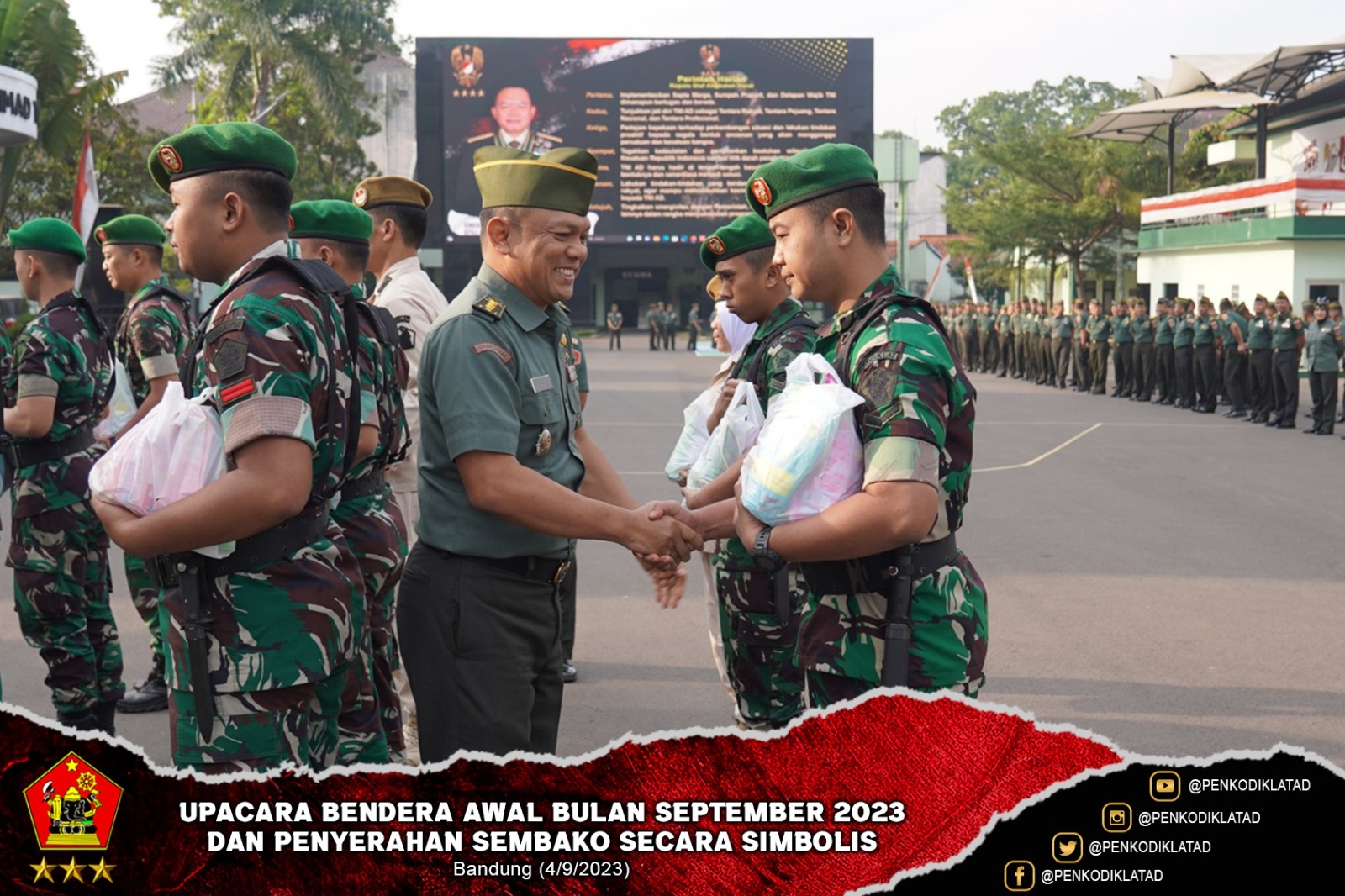 Setelah pelaksanaan upacara selesai dilanjutkan dengan penyerahan Sembako secara simbolis oleh Pabanter Sdirum Kodiklatad kepada perwakilan personel dari masing-masing Satker. Penyerahan sembako ini merupakan bentuk perhatian Komandan Kodiklatad, Letjen TNI Arif Rahman, M.A. kepada personel Kodiklatad beserta keluarganya.