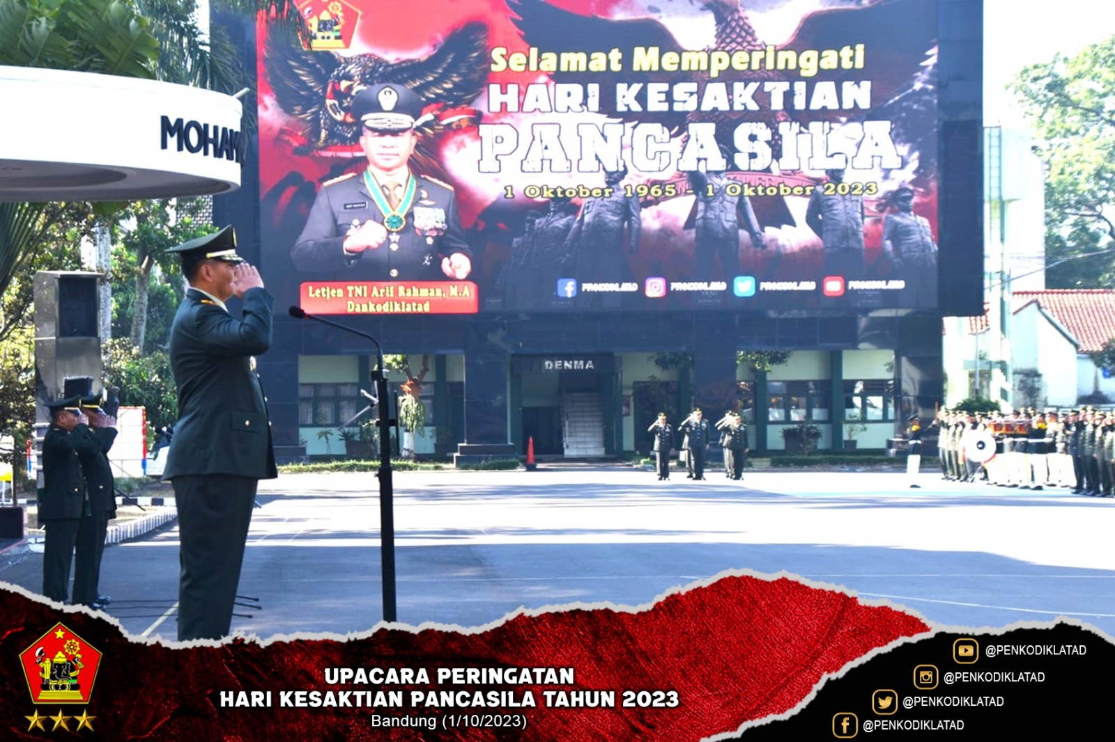 Bandung. Untuk mengenang jasa para Pahlawan Revolusi dalam mempertahankan nilai-nilai Pancasila, Wakil Komandan Kodiklatad Mayjen TNI Kunto Arief Wibowo, S.I.P. memimpin Upacara Peringatan Hari Kesaktian Pancasila Tahun 2023 yang dilaksanakan di Lapangan Upacara Makodiklatad. Minggu (1/10/2023)